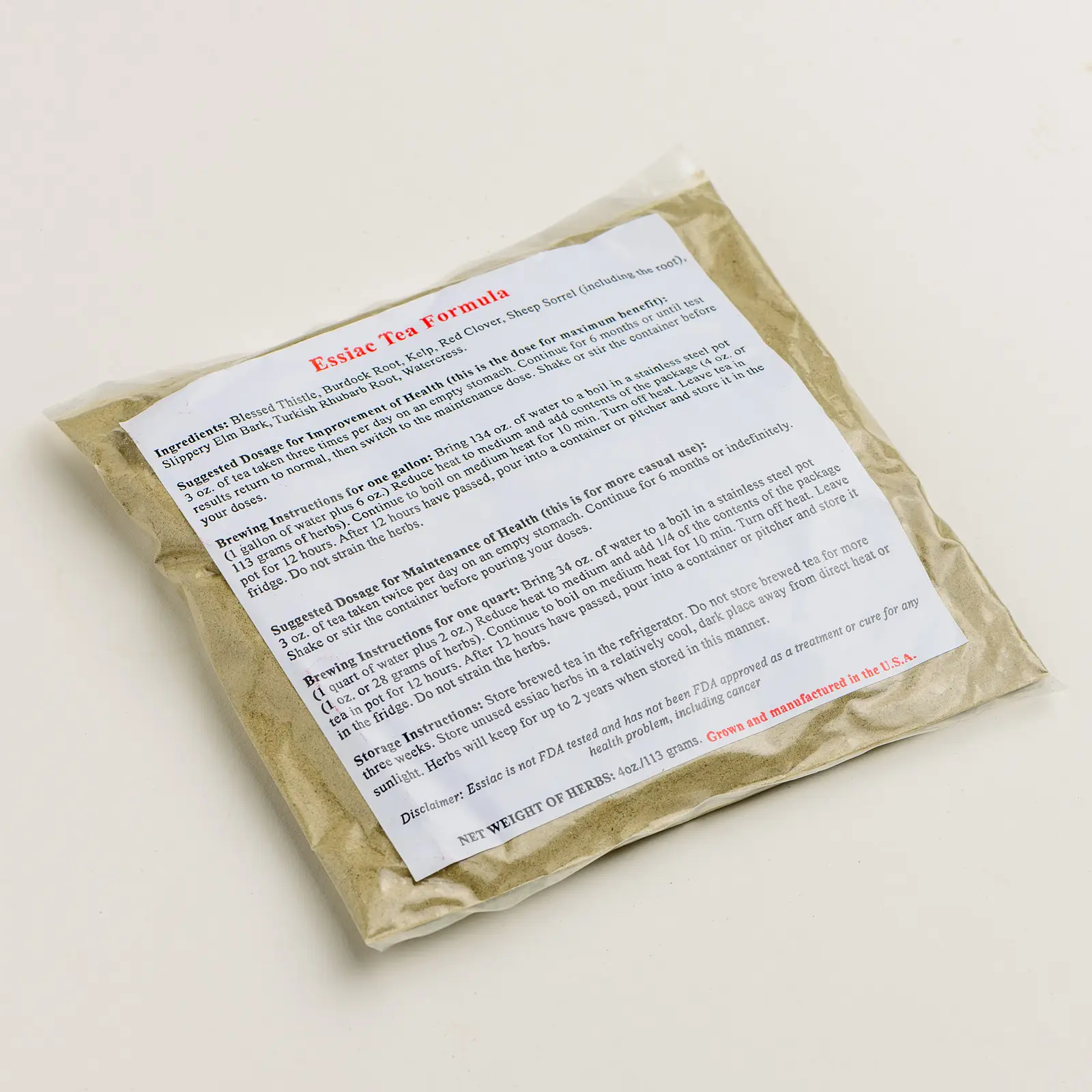 Avec un sachet de 113 grammes d’herbes Essiac, vous pouvez préparer 4 litres de thé Essiac, ce qui est suffisant pour 40 tasses. Pour une extraction optimale des propriétés bénéfiques des herbes, nous vous conseillons de faire bouillir doucement les herbes pendant 10 minutes. Étant donné que certaines herbes contiennent des racines, ce temps de cuisson est essentiel. Après la cuisson, laissez infuser le thé pendant au moins 12 heures et au maximum 24 heures hors du réfrigérateur, afin que tous les composants précieux puissent être absorbés. Conservez ensuite le thé de préférence dans une bouteille en verre au réfrigérateur.